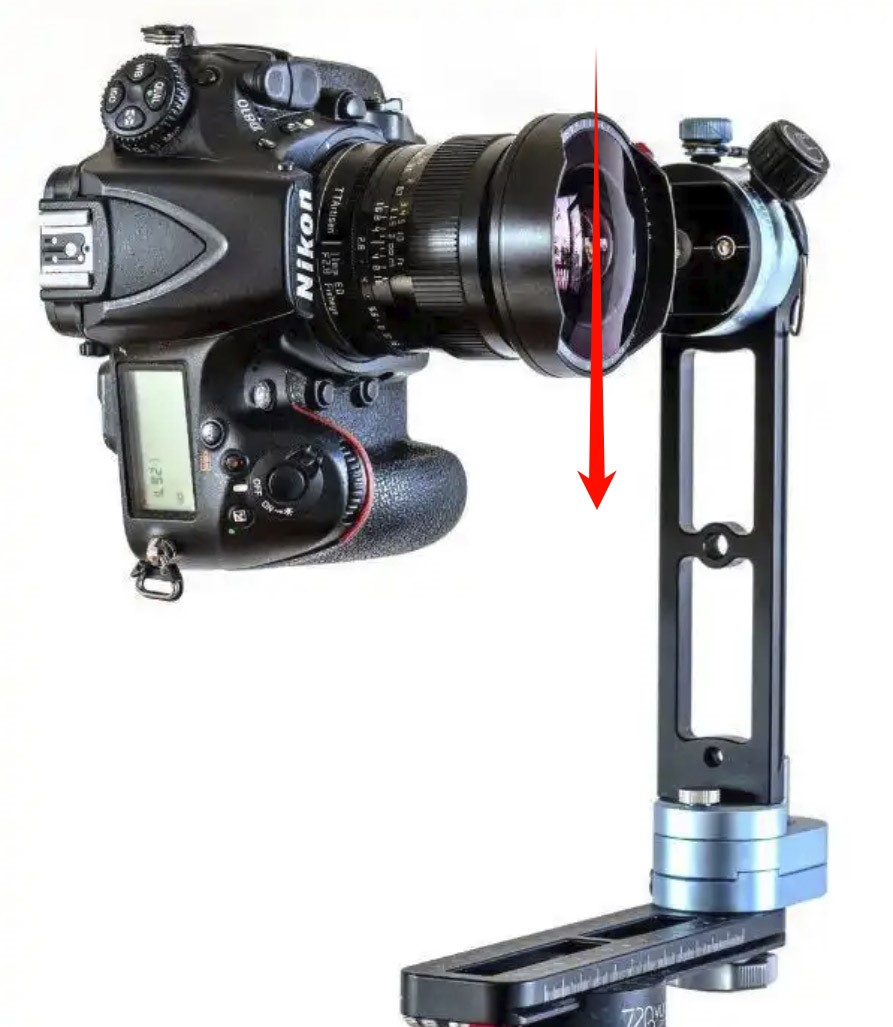在我们进行黄山VR全景拍摄的过程中,除了部分要求不高的使用VR全景相机外,黄山专业的都是用专业相机,我们在使用专业相机的时候,必不可少的就是VR云台,在长时期用过VR云台的人我想都会遇到一个相当无语的问题:拍摄过程中会出现相像镜头向正下文下垂,如下图箭头方向下垂。